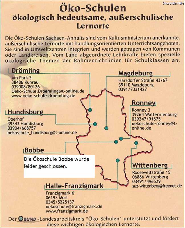 Angaben zu Adressen ohne Garantie, die Ökoschule in der Ökodomäne Bobbe besteht leider nicht mehr!